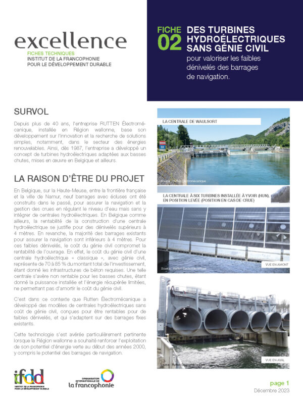 Depuis plus de 40 ans, l’entreprise RUTTEN Électromécanique, installée en Région wallonne, base son développement sur l’innovation et la recherche de solutions simples, notamment, dans le secteur des énergies renouvelables. Ainsi, dès 1987, l’entreprise a développé un concept de turbines hydroélectriques adaptées aux basses chutes, mises en oeuvre en Belgique et ailleurs.